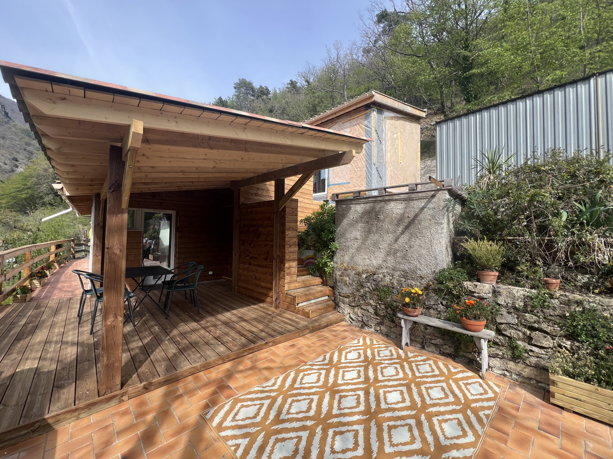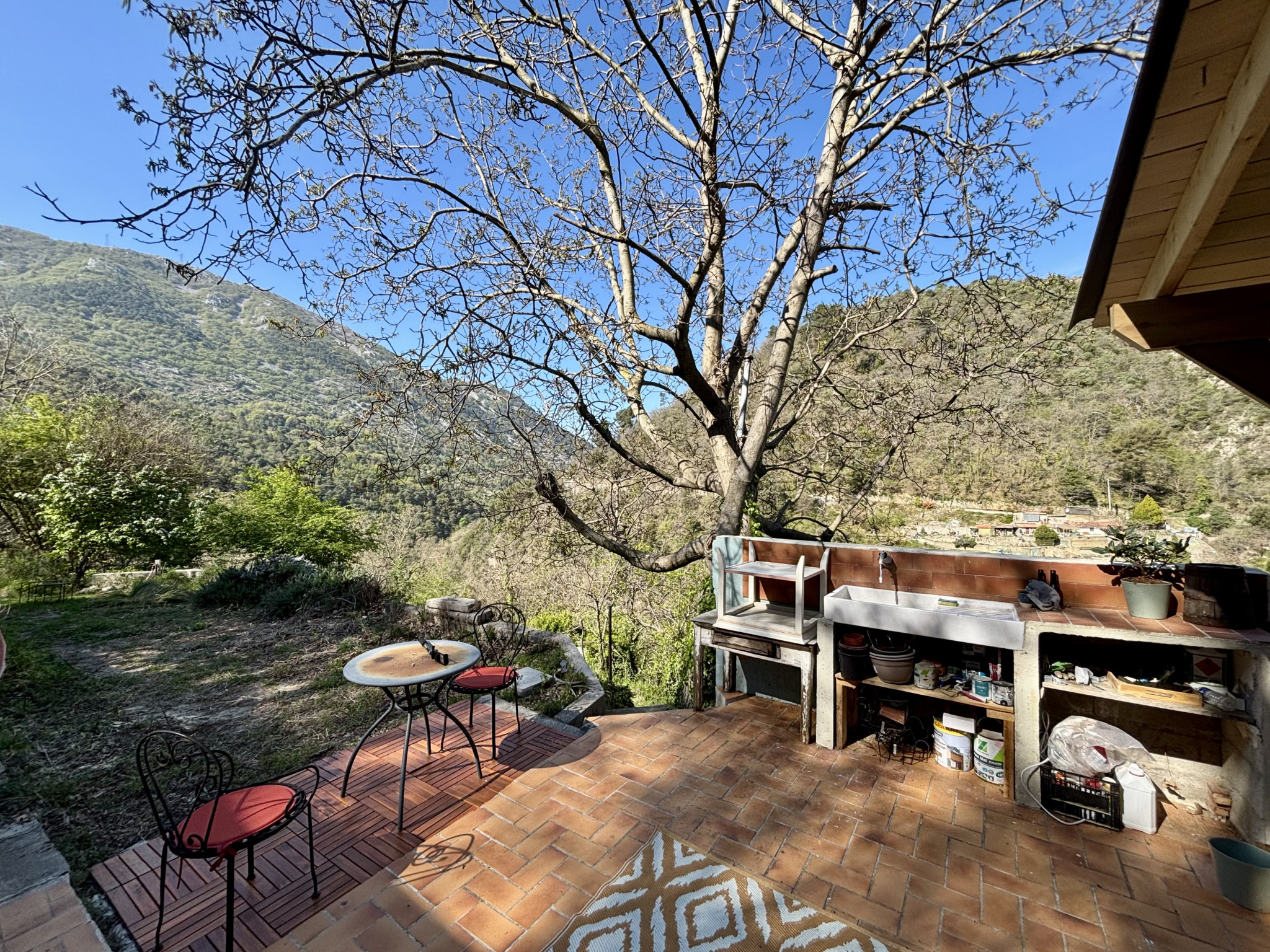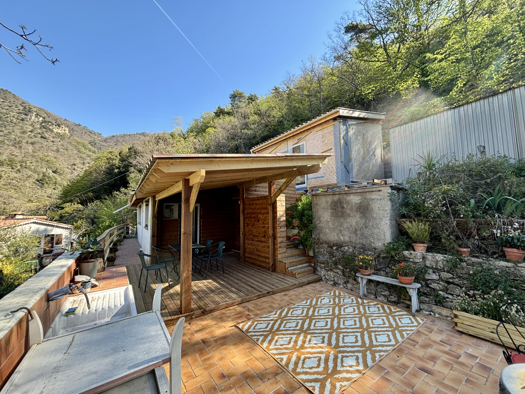 Vous serez immédiatement séduit par sa magnifique terrasse en bois, prolongée par deux restanques idéales pour un potager ou l’installation d’une piscine. L’ensemble s’ouvre sur un grand terrain entièrement boisé, offrant une superbe vue dégagée exposée plein sud.